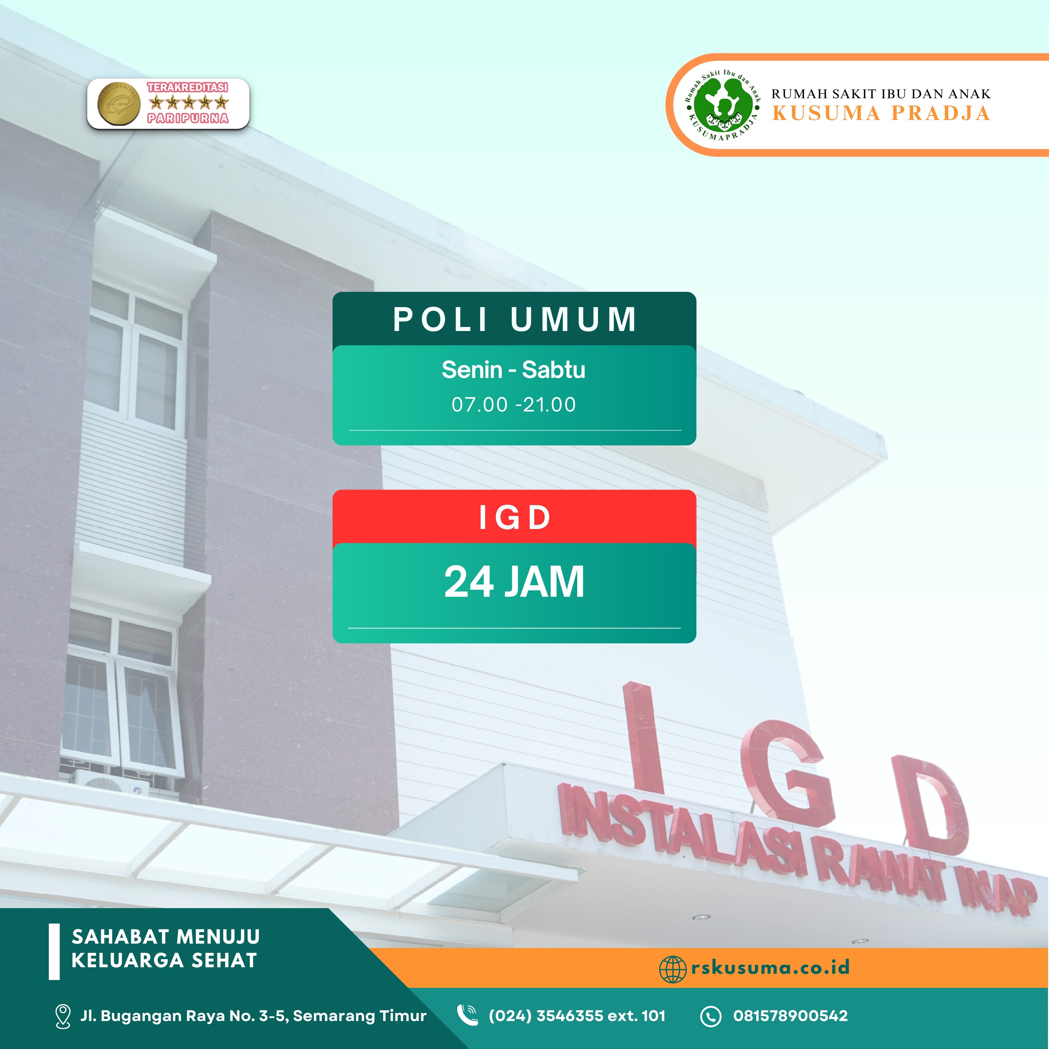 RSIA Kusuma Pradja berada di Jalan Bugangan Raya No.3-5, Semarang.